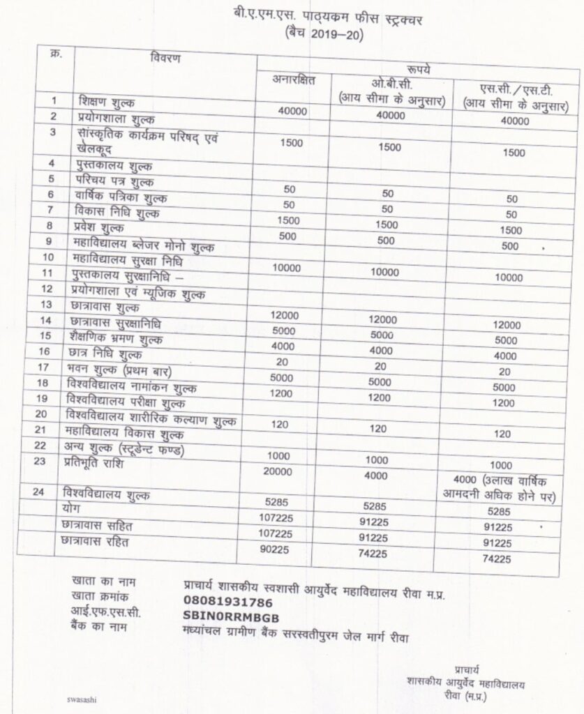 The below section shows the Government Ayurvedic College Rewa BAMS and MD fee Structure.